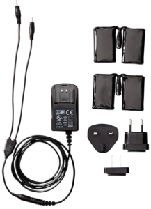 It comes integrated with a Lithium-ion rechargeable battery and an adapter for charging.